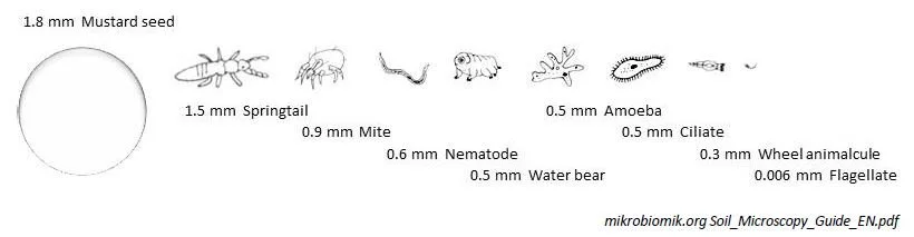 The soil around us is full of life. Microbes, miniscule creatures. When compared (simplistically) with the size of a mustard seed, a springtail is almost as large, a mite is half the size, nematodes, water bears, amoeba and ciliate are a third, a wheel animalcule even smaller, and then there are extremely tiny creatures like the flagellate that is 300th the size of a mustard seed. And there is much more…. microalgae, fungi, bacteria, archaea…. on and on!
